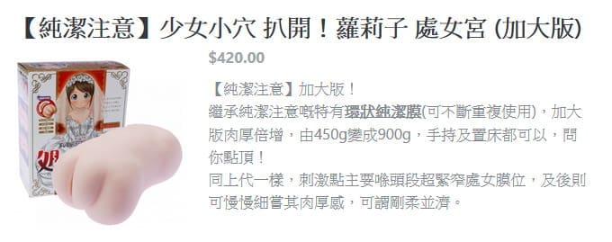 膠如其名嘅仿處女管道,由大受好評嘅前作「少女小穴 扒開!蘿莉子」增重一倍嘅加大版,重量足足有成900g!管道由主打嘅特設處女膜以至子宮口嘅構造都非常講究,可謂緊窄刺激型嘅最高峰。相對地,管道狹窄會令清洗難易度變高,如果唔想咁快爛仲想用多幾次就要小心啲清洗啦。