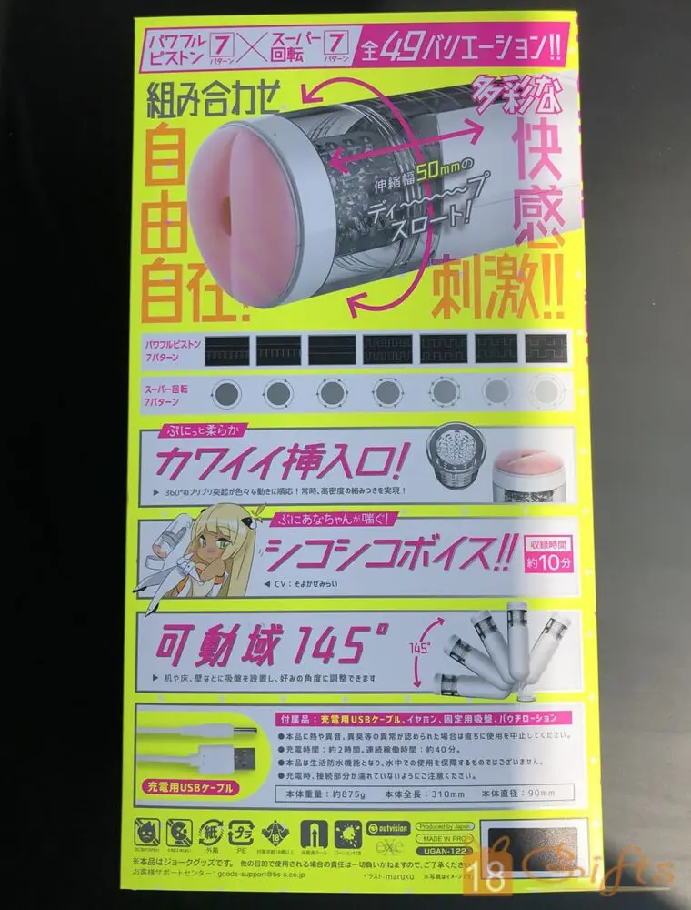 背面係詳細規格,7種抽插模式×7種轉動模式=合共49種變化,仲內置咗由成人遊戲聲優「そよかぜみらい」嘅真人配音!更添臨場感!