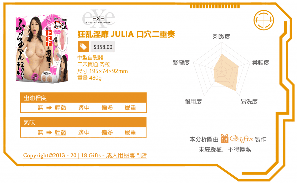 大家好,今次會開箱嘅成人用品係由EXE推出嘅二穴自慰器「狂乱淫靡 JULIA 口穴二重奏」。