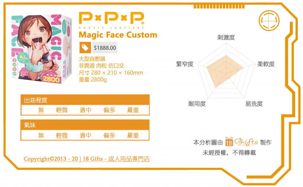 全頭式口交自慰器嘅始祖「Magic Face」,回顧返初代嘅Magic Face已經係5年前嘅產物,3年過後再同成人遊戲系列《對魔忍》合作推出第2代,兩款至今都大受好評,而今次嘅續作並唔係接住落去叫「Magic Face 3」,而係Magic Face Custom!究竟可以點Custom呢?唔通可以好似歐美品牌啲自製假狗咁自己捏個頭出嚟?應該無咁誇張掛