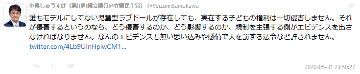 日本立憲民主黨議員小泉秀輔於個人推特上表示「兒童型等身娃娃本來就沒有仿照特定的兒童作藍本設計而成,對現實的兒童根本不會造成人權侵害。要說這也算是侵害的話,究竟是如何侵害,怎樣造成影響,主張立法規管的一方理應提出相當証據。毫無証據的隔山觀海或主觀臆斷而對人執法的法律是不被允許的。」