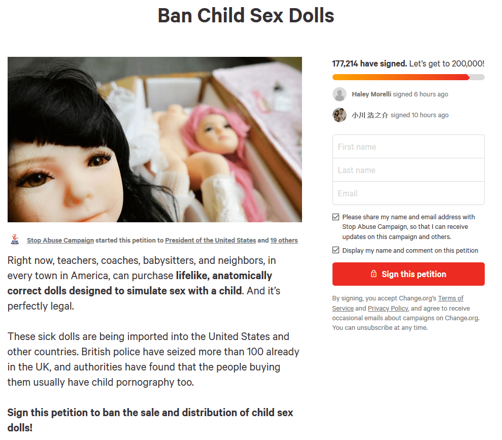近日,兒童色情的爭論終究牽連到成人用品行列,世界各地開始對兒童型的等身娃娃進行規管,發起「Ban Child Sex Dolls」聯署要求禁止海外販賣相關產品,至今已經超過17萬人簽署。該聯署的起因可追溯至2017年,美國共和黨的丹·多諾萬下院議員提出了禁止搭載人工智能的等身娃娃「Child Sex Robot」法案,隨後韓國也於去年發起了禁止等身娃娃進口聯署,亦獲得超過20萬人簽名請願。