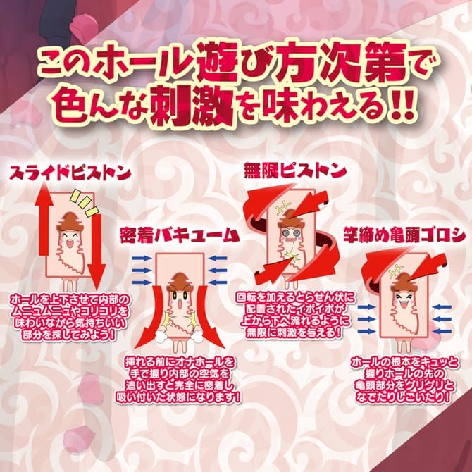 它是一種可以根據您的插入方式來享受各種不同刺激的自慰器,例如單純地滑動活塞,旋轉+螺旋活塞,享受真空狀態,以及僅集中攻擊龜頭等,玩法非常多元化!