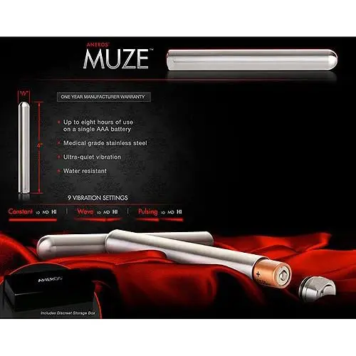 美國品牌 Aneros 的 Muze 為不鏽鋼子彈震動器,採用FDA認可不鏽鋼材質,棒身親膚無縫,觸感光滑舒適。簡約風設計迷你子彈震動器,體積極致幼小,易於收藏,但震力強勁,令你有無限快感!一鍵開關,使用簡單,設有多種震動模式,靜音設計,防水,使用一顆AAA電池即可享約8小時歡愉。