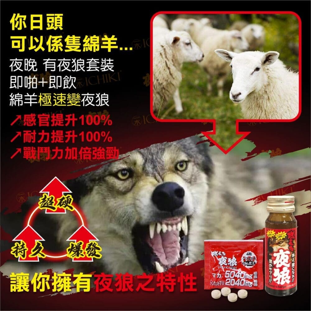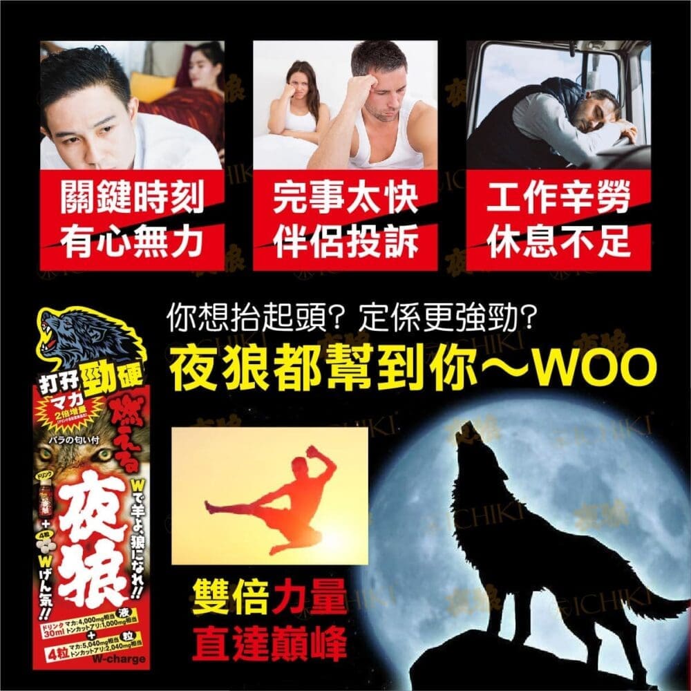 夜狼套裝專為東方男士研製,嚴選超過18種至勁威猛成分製成,包括超高濃度瑪卡(9040mg)及東革阿里(3040 mg),先食4粒後飲1支,快速起效,加倍持久力, 讓你由綿羊速變夜狼,體驗超極致銷魂快感。