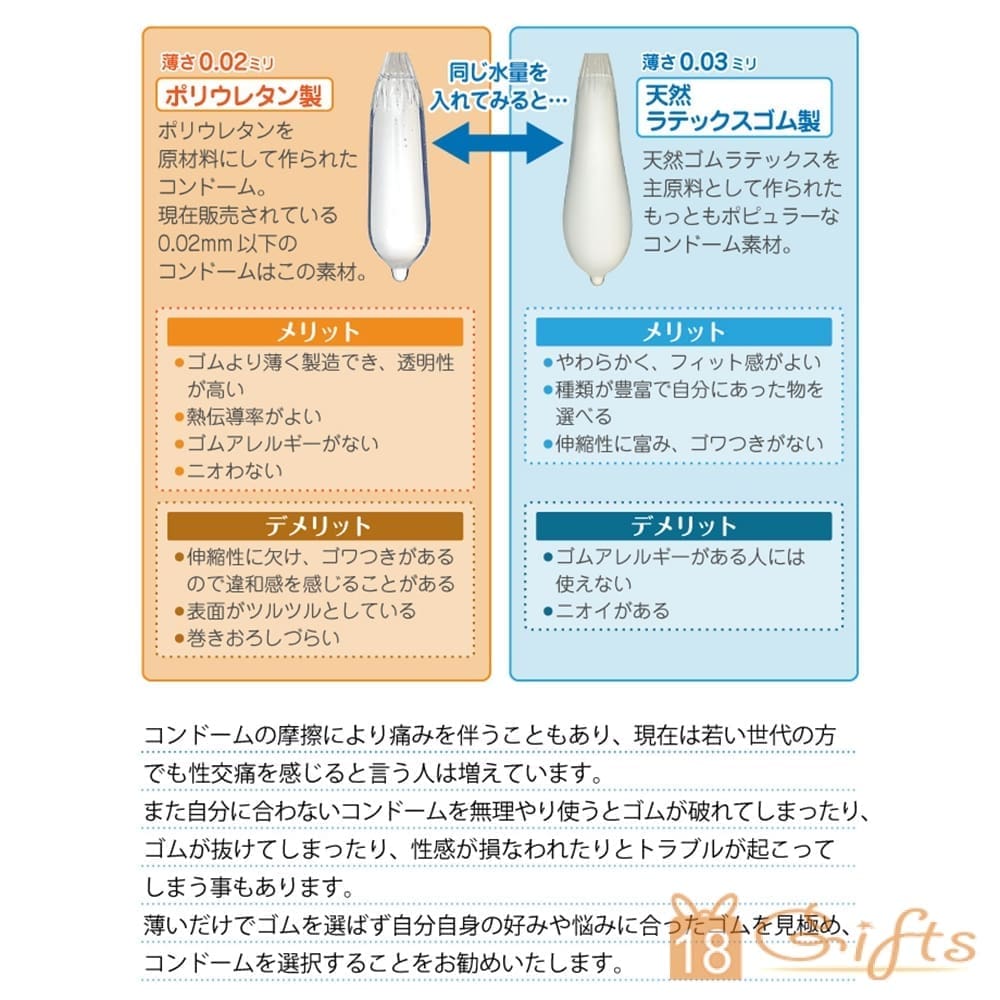 日本製 Jex0.02 標準裝(6片裝),直徑35.6mm;圓周112mm;闊度 56mm;最長175mm;厚度0.02mm,採用透明色,極強的透明感。使用“水性聚氨酯”材質。表面含潤滑劑加工,亦經過除味處理。不過敏、高強度、導熱性高。Jex 0.02 安全套沒有乳膠安全套所特有的橡膠氣味,是完全無臭無味的。