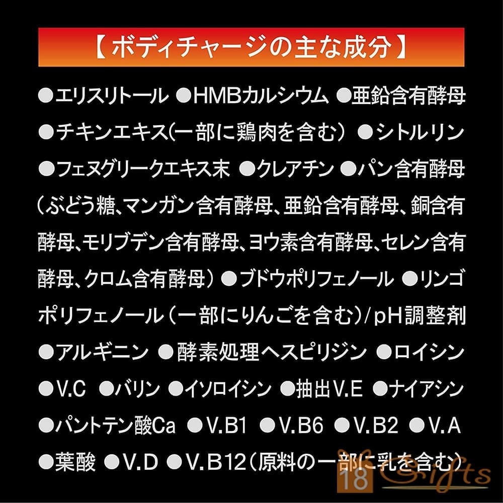 原材料名:赤藻糖醇、HMB鈣、富亞鉛酵母、雞肉萃取物(含雞肉)、瓜氨酸、油脂加工食品(植物油脂)、乳蛋白(含乳成份)、葫蘆巴提取物、肌酸、酵母(葡萄糖、富錳酵母、富亞鉛酵母、富銅酵母、富鉬酵母、富碘酵母、富硒酵母、富鉻酵母)、葡萄多酚、蘋果多酚(含蘋果)/酸度調節劑、精氨酸、香料、甜味劑(乙醯磺胺酸鉀、三氯蔗糖、甜菊糖)、酵素處理橙皮苷、白氨酸、維生素C、乳化劑、纈胺酸、異白氨酸、維生素E抽出物、菸鹼酸、泛酸钙、維生素B1、維生素B6、維生素B2、維生素A、葉酸、維生素D、維生素B12