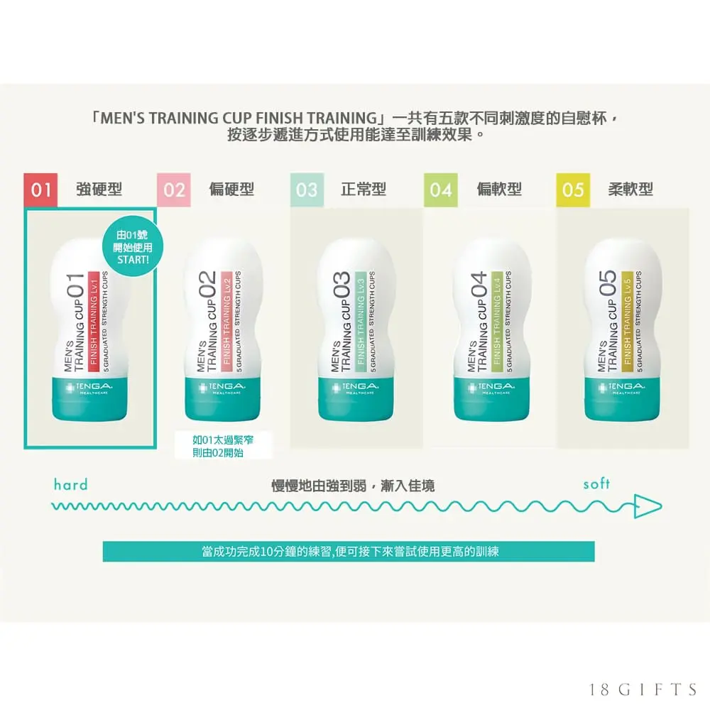 「MEN’S TRAINING CUP FINISH TRAINING」一共有五款不同刺激度的自慰杯,按逐步遞進方式使用能達至訓練效果。