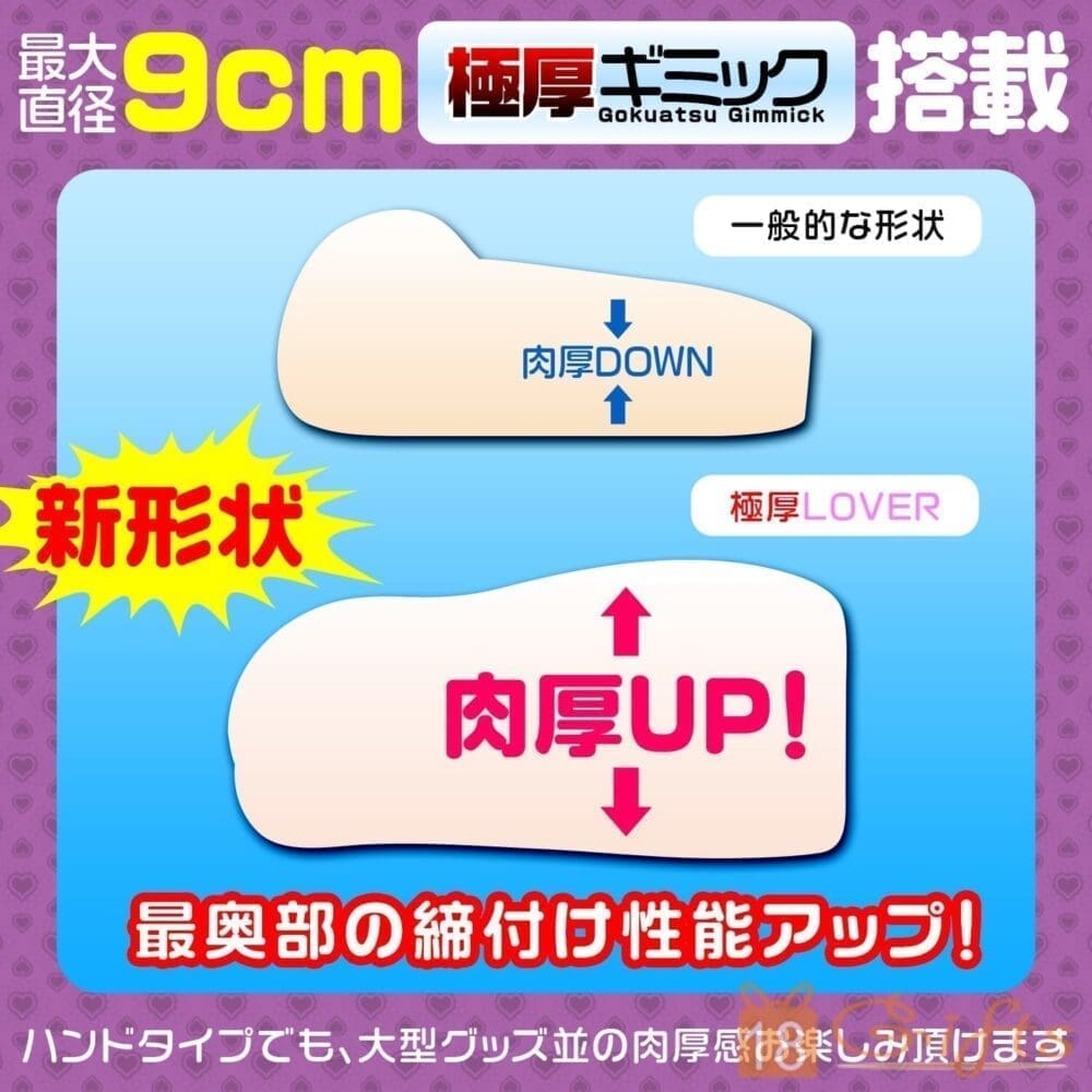 極厚Lover當然係達600g嘅極厚級,而且佢仲用咗全新設計,使其平均厚度都得以保持,加上仲有3層設計,分為皮膚層、膣肉層、粘膜層,使其觸感更仿真。而管內則有連續直紋刺激龜頭,並有仿子宮口收窄位供閣下突入,最深部仲有使你爆射嘅子宮璧凸粒位,讓你嘅欲望得以滿足!