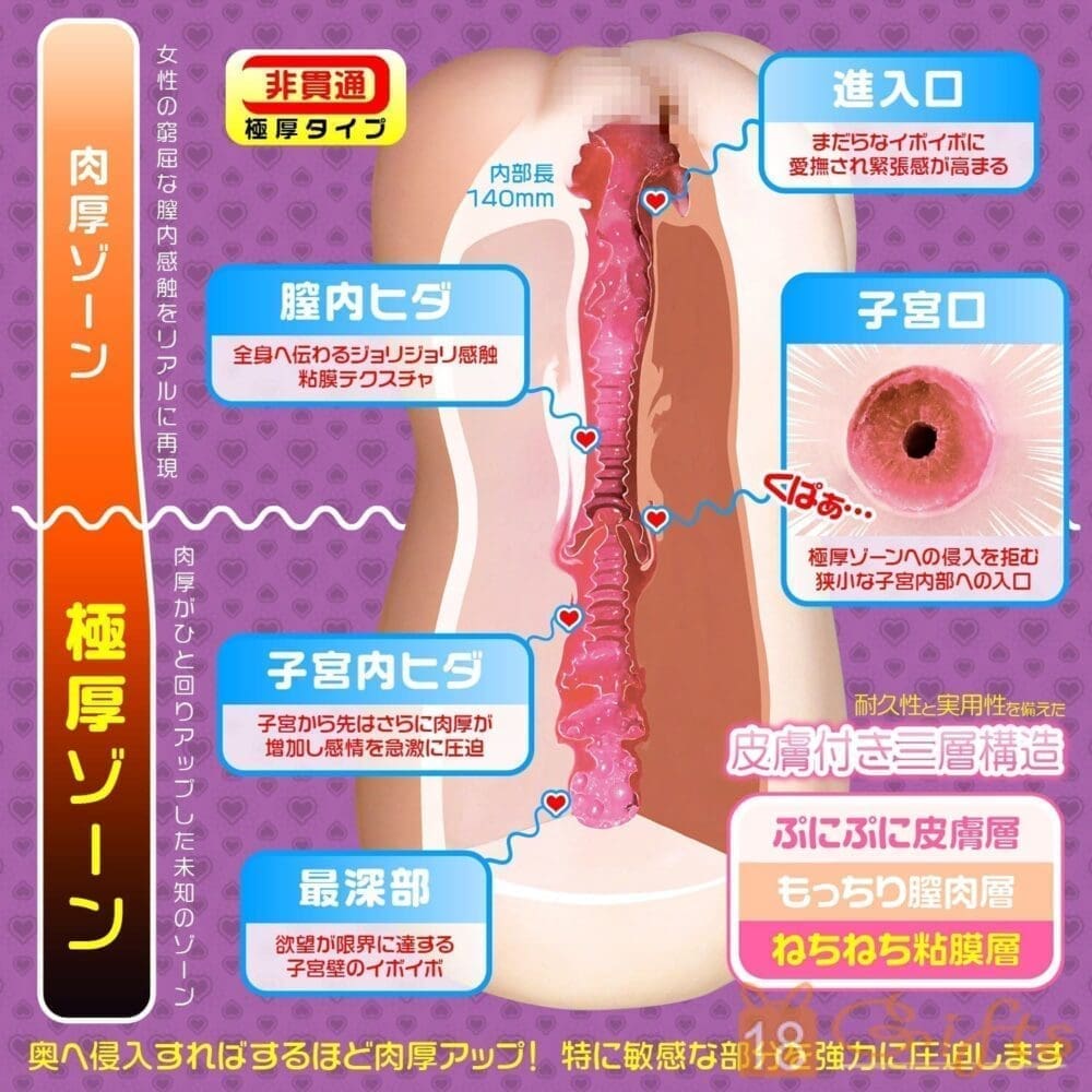 1. 獨創三層結構(Triple Layer) 最出名嘅「純潔新娘處女宮」(純潔のミルク 処女宮)系列,外面係粉嫩皮膚色、中間係紅色子宮層、最內係白色精液色,三種硬度物料一次成型,切開會見到明顯三色層,視覺同觸感極度衝擊。
